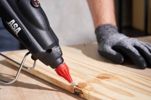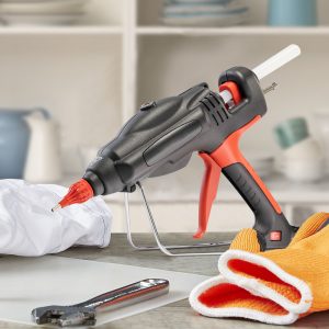 H-300 features a 300-watt thermostat heater with adjustable temperature 250°C-445°F, ergonomic grip, on/off switch, and stroke adjustor for precise glue output. It works with various nozzles for different applications and is suitable for both DIY and professional use.